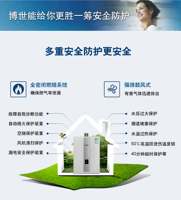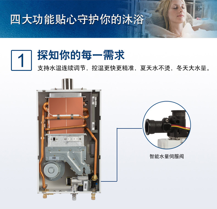 智能恒溫控制系統(tǒng),超寬頻水量調(diào)節(jié)。通過搭載伺服電機(jī),根據(jù)設(shè)定溫度連續(xù)調(diào)節(jié)水量,舒適節(jié)能到極致。一氧化碳探測報(bào)警器,細(xì)心呵護(hù)您的安全。更有多點(diǎn)控制,可連接兩個(gè)遠(yuǎn)程遙控器, 控制更方便快捷。