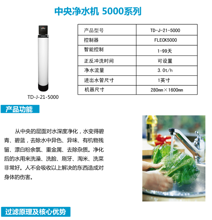 全屋凈水中央凈水機有效去除水中的異色、異味;進一步濾除水中微小雜質、膠狀體;去除水中的漂白粉余氯、農藥、重金屬;保留對人體有益的礦物質。使水變得碧清、碧藍,去除對人體有害的物質。