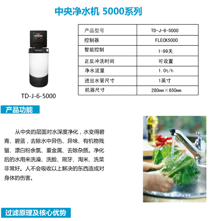 全自動中央凈水機有效去除水中的異色、異味;進一步濾除水中微小雜質、膠狀體;去除水中的漂白粉余氯、農藥、重金屬;保留對人體有益的礦物質。使水變得碧清、碧藍,去除對人體有害的物質。